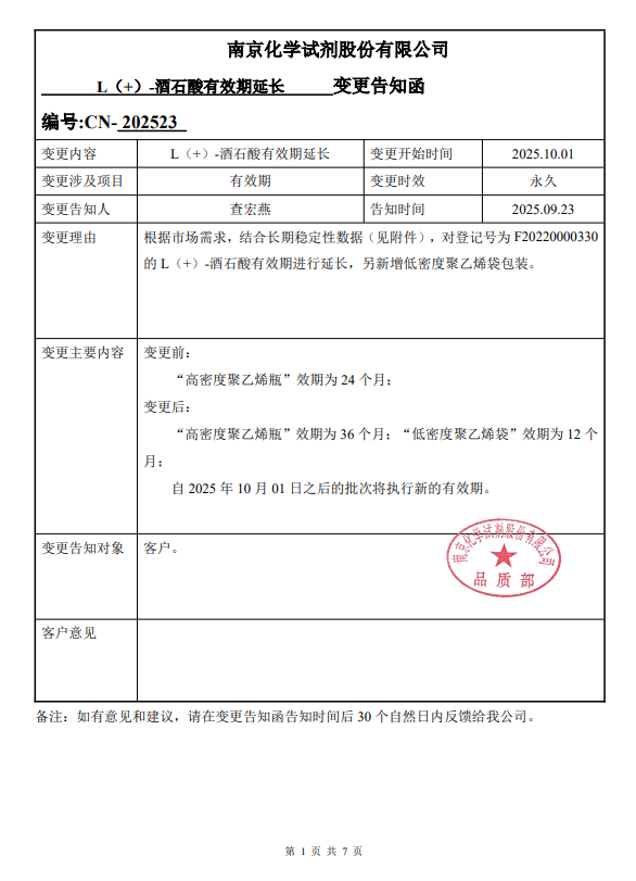 根據(jù)市場(chǎng)需求,對(duì)登記號(hào)為F20220000330的 L(+)-酒石酸有效期進(jìn)行延長(zhǎng),另新增低密度聚乙烯袋包裝。